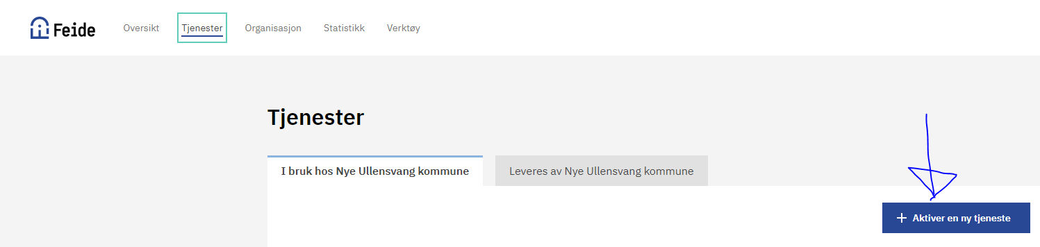 Dersom du ikke finner en feidetjeneste eller ønsker å ta i bruk nye må du aktivere dem. For å aktivere nye Feidetjenester må det gjøres på http://kunde.feide.no . Logg inn som administrator på http://kunde.feide.no og aktiver tjenestene der: